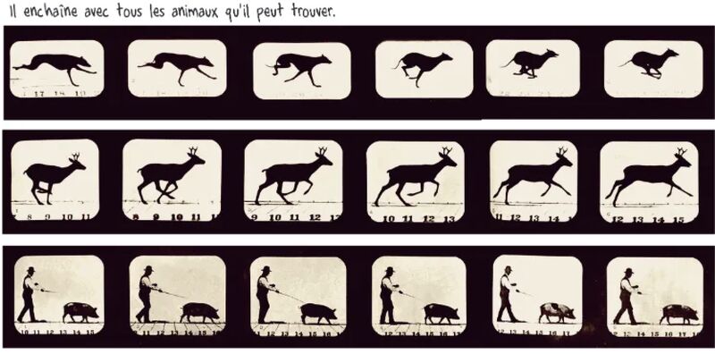 Guy raconte l’histoire méconnue d’un des pionniers du cinéma et de la photo, Eadweard Muybridge, dont vous connaissez le travail sans doute, il a décomposé les mouvements d’animaux, dont ceux du cheval en particulier, une biographie magique, pleine de rebondissements poétiques.